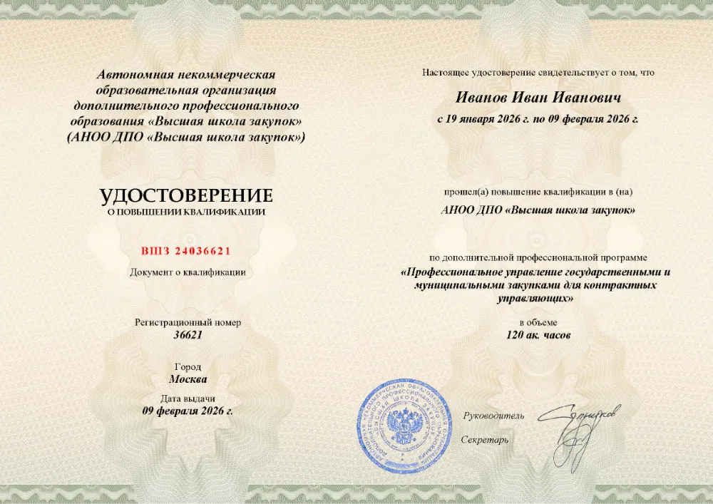 Вы получаете официальные документы об образовании (дипломы и удостоверения). Высшая школа закупок (fz44.org) в обязательном порядке вносит все сведения в федеральный реестр ФИС ФРДО, подтверждая вашу квалификацию перед любым государственным или коммерческим работодателем Ульяновска.