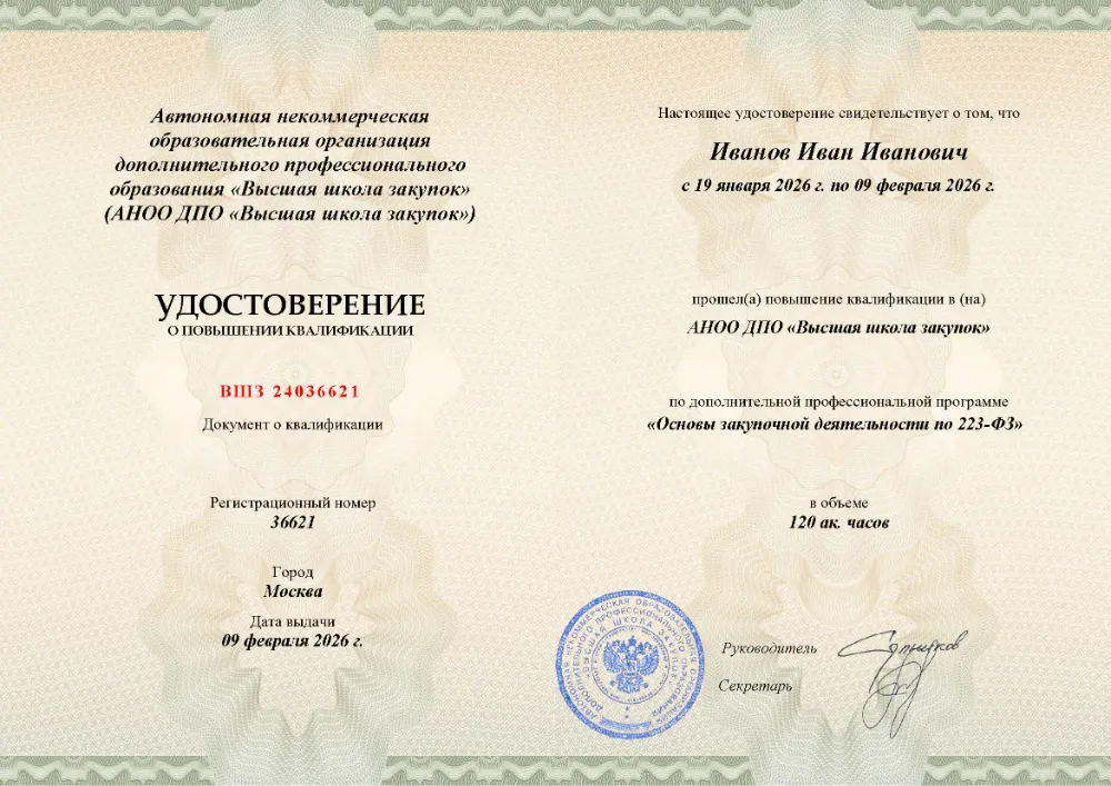 Вы получаете официальные документы об образовании (дипломы и удостоверения). Высшая школа закупок (fz44.org) в обязательном порядке вносит все сведения в федеральный реестр ФИС ФРДО, подтверждая вашу квалификацию перед любым государственным или коммерческим работодателем Ульяновска.