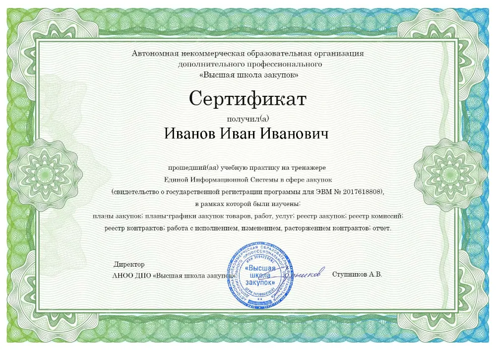 Вы получаете официальные документы об образовании (дипломы и удостоверения). Высшая школа закупок (fz44.org) в обязательном порядке вносит все сведения в федеральный реестр ФИС ФРДО, подтверждая вашу квалификацию перед любым государственным или коммерческим работодателем Ульяновска.