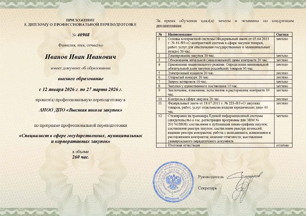 Вы получаете диплом о профессиональной переподготовке с присвоением квалификации специалиста. Высшая школа закупок (fz44.org) вносит все данные в реестр Рособрнадзора, подтверждая вашу компетенцию для госслужбы и корпораций Ульяновска.