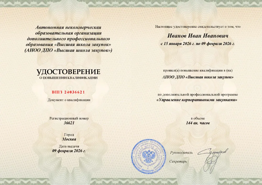 Вы получаете официальный документ о повышении квалификации. Высшая школа закупок (fz44.org) в обязательном порядке вносит сведения об обучении в Ульяновске в реестр ФИС ФРДО, подтверждая легитимность вашей подготовки перед контролерами.